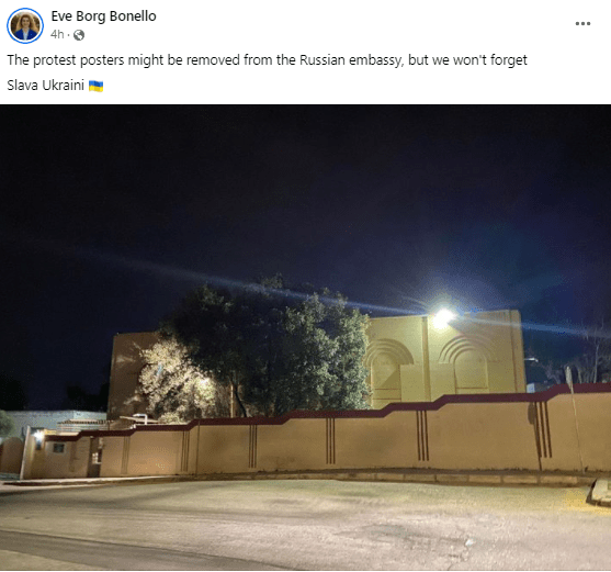 On Facebook, PN candidate Eve Borg Bonello posted a photo of the Russian Embassy. She says that the protest posters have been removed.